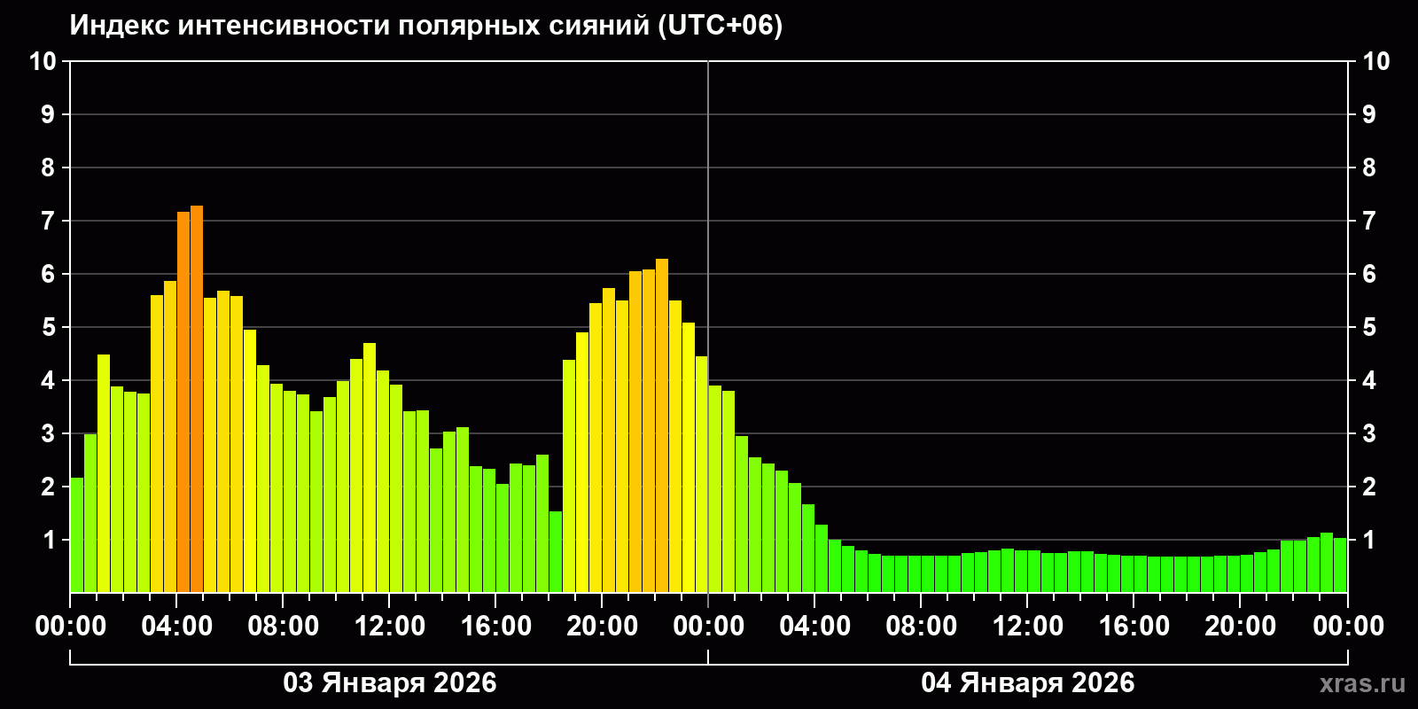 Изменения индекса интенсивности полярных сияний с 2026-01-03 по 2026-01-04 по местному времени