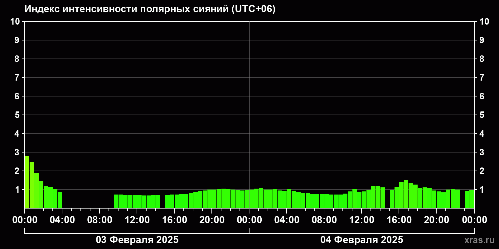 Изменения индекса интенсивности полярных сияний с 2025-02-03 по 2025-02-04 по местному времени