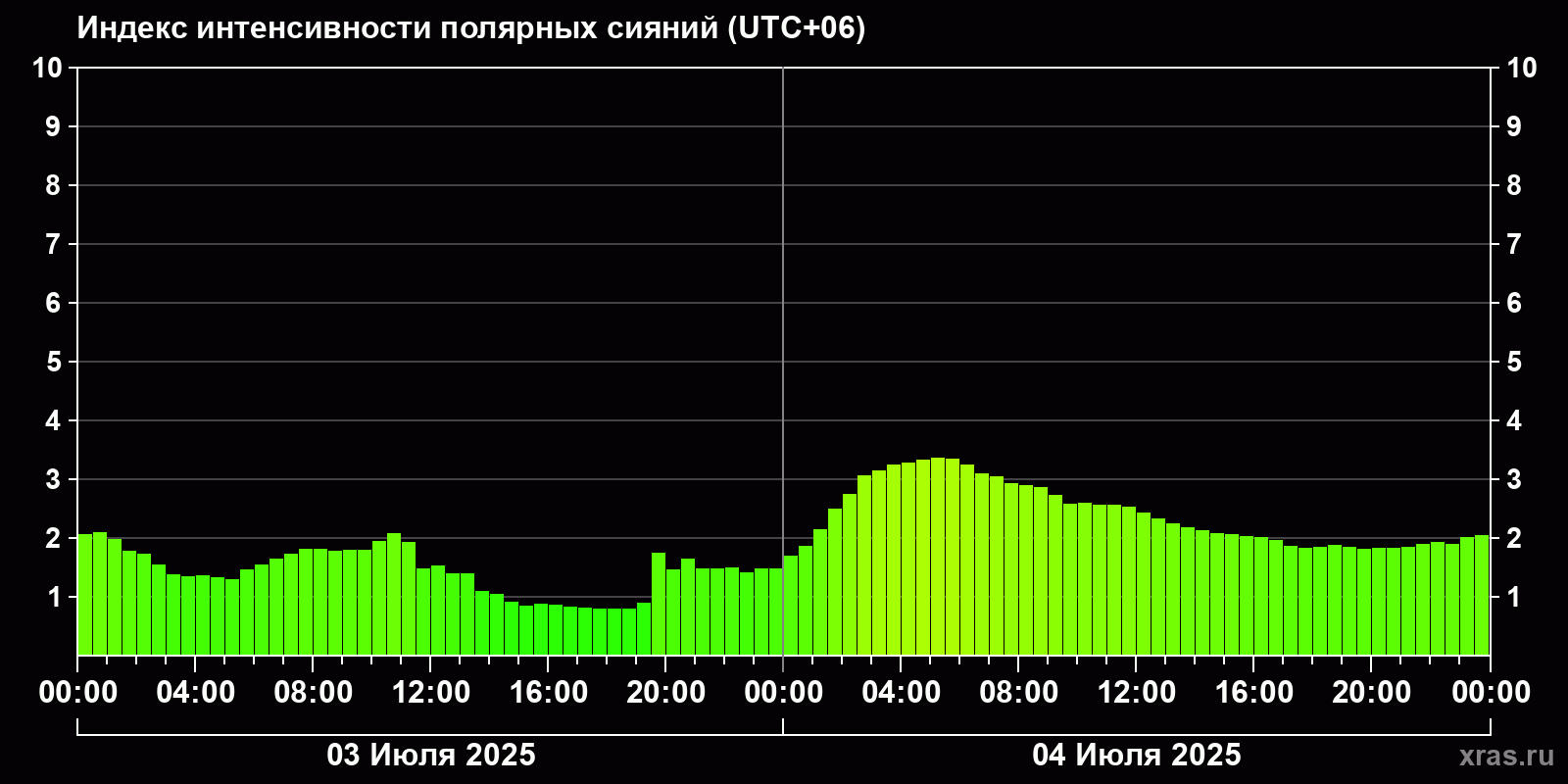 Изменения индекса интенсивности полярных сияний с 2025-07-03 по 2025-07-04 по местному времени
