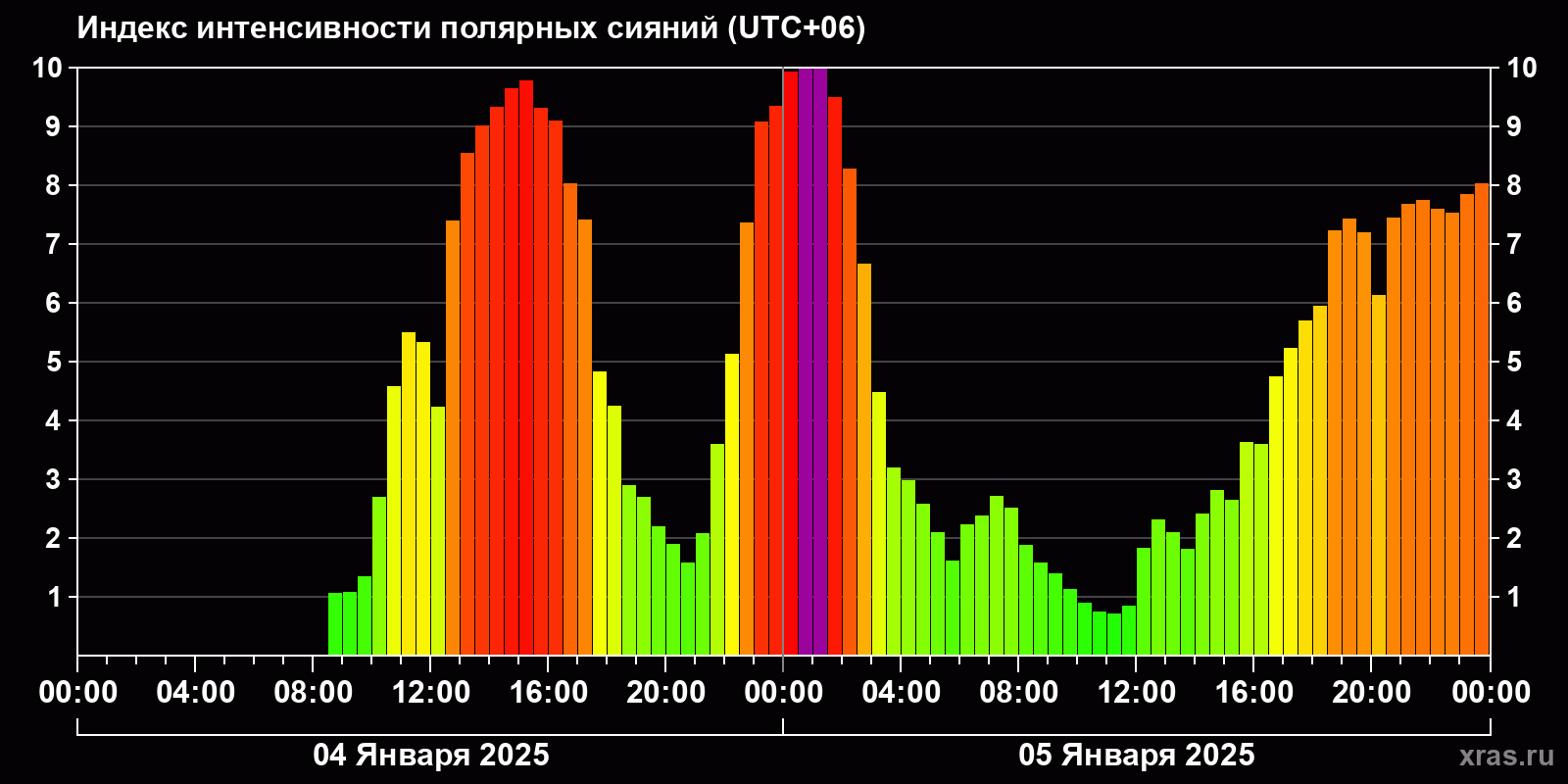 Изменения индекса интенсивности полярных сияний с 2025-01-04 по 2025-01-05 по местному времени