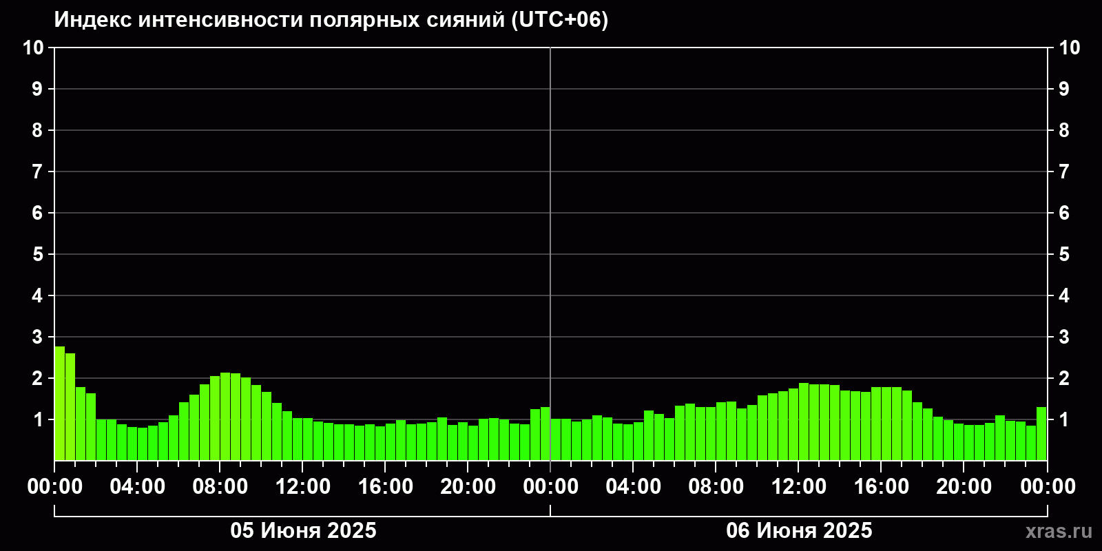 Изменения индекса интенсивности полярных сияний с 2025-06-05 по 2025-06-06 по местному времени
