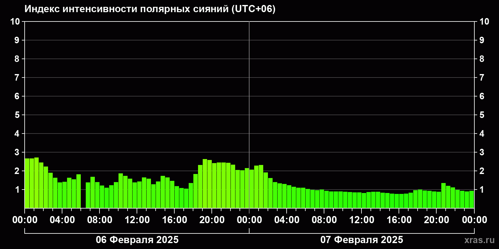 Изменения индекса интенсивности полярных сияний с 2025-02-06 по 2025-02-07 по местному времени