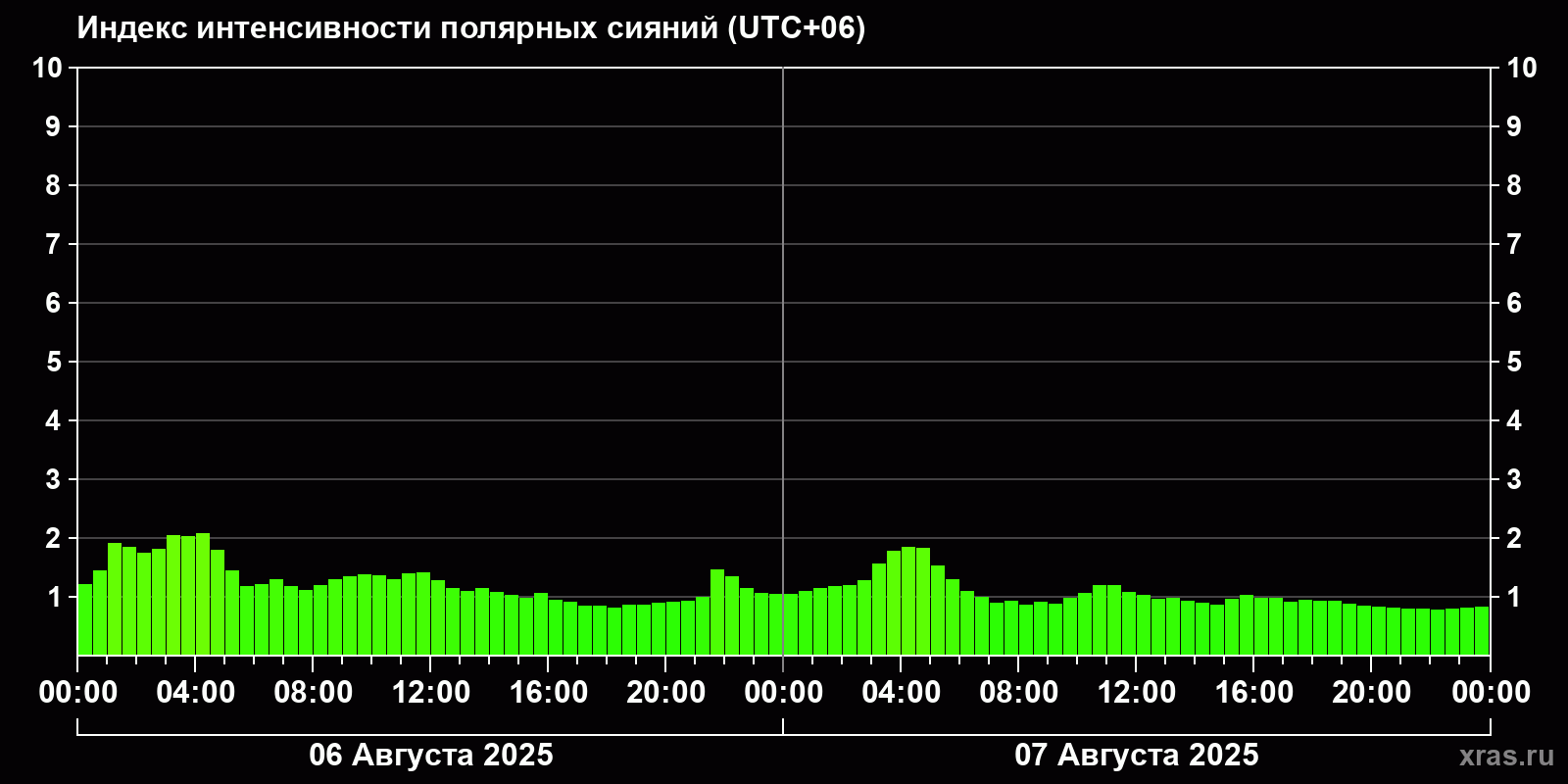 Изменения индекса интенсивности полярных сияний с 2025-08-06 по 2025-08-07 по местному времени