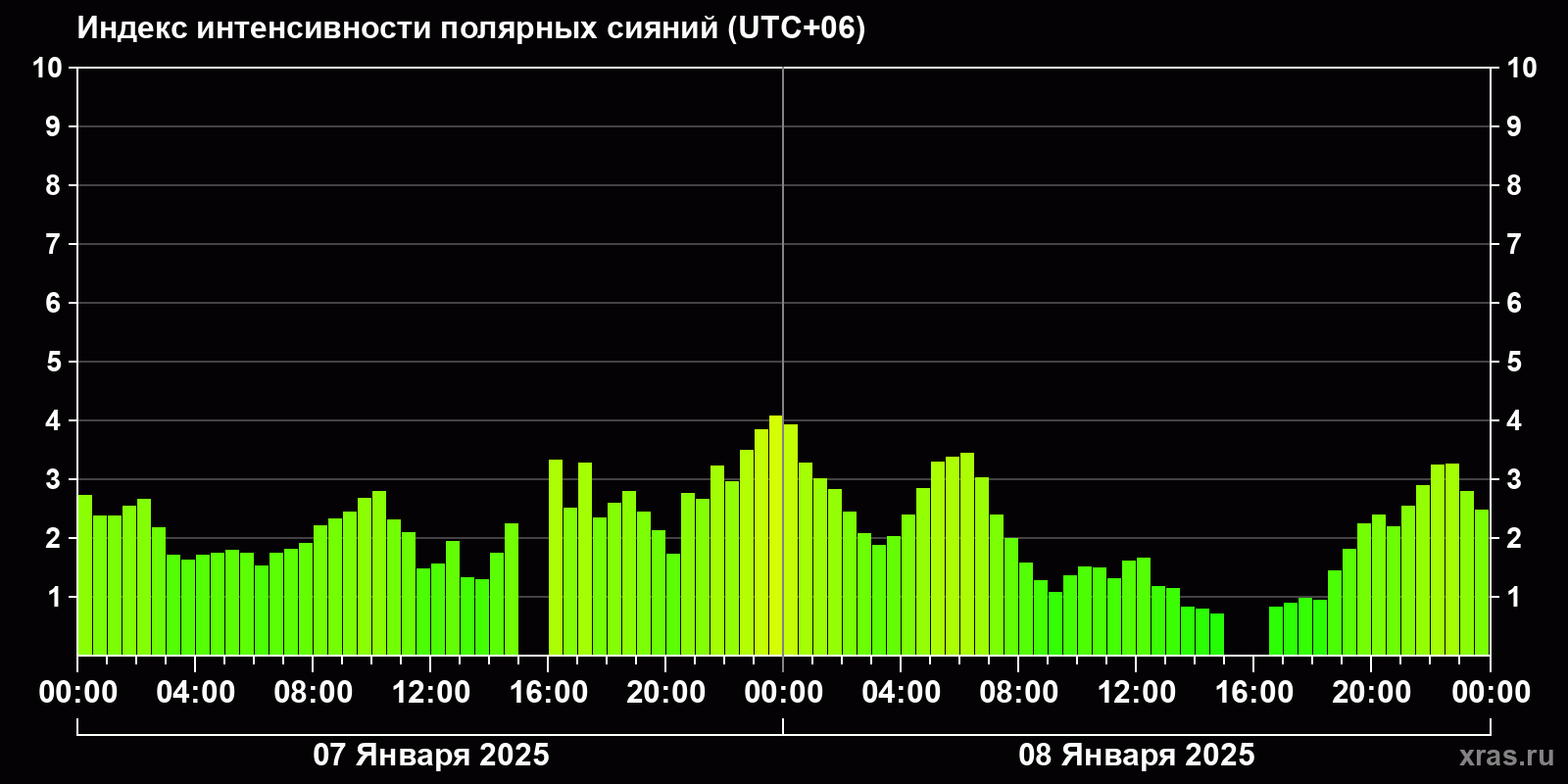 Изменения индекса интенсивности полярных сияний с 2025-01-07 по 2025-01-08 по местному времени