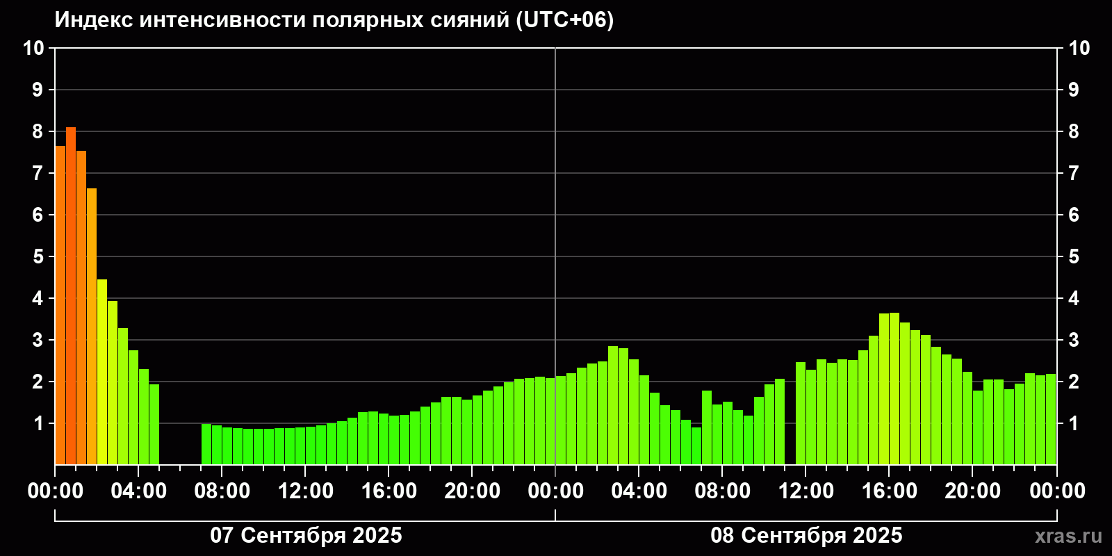 Изменения индекса интенсивности полярных сияний с 2025-09-07 по 2025-09-08 по местному времени