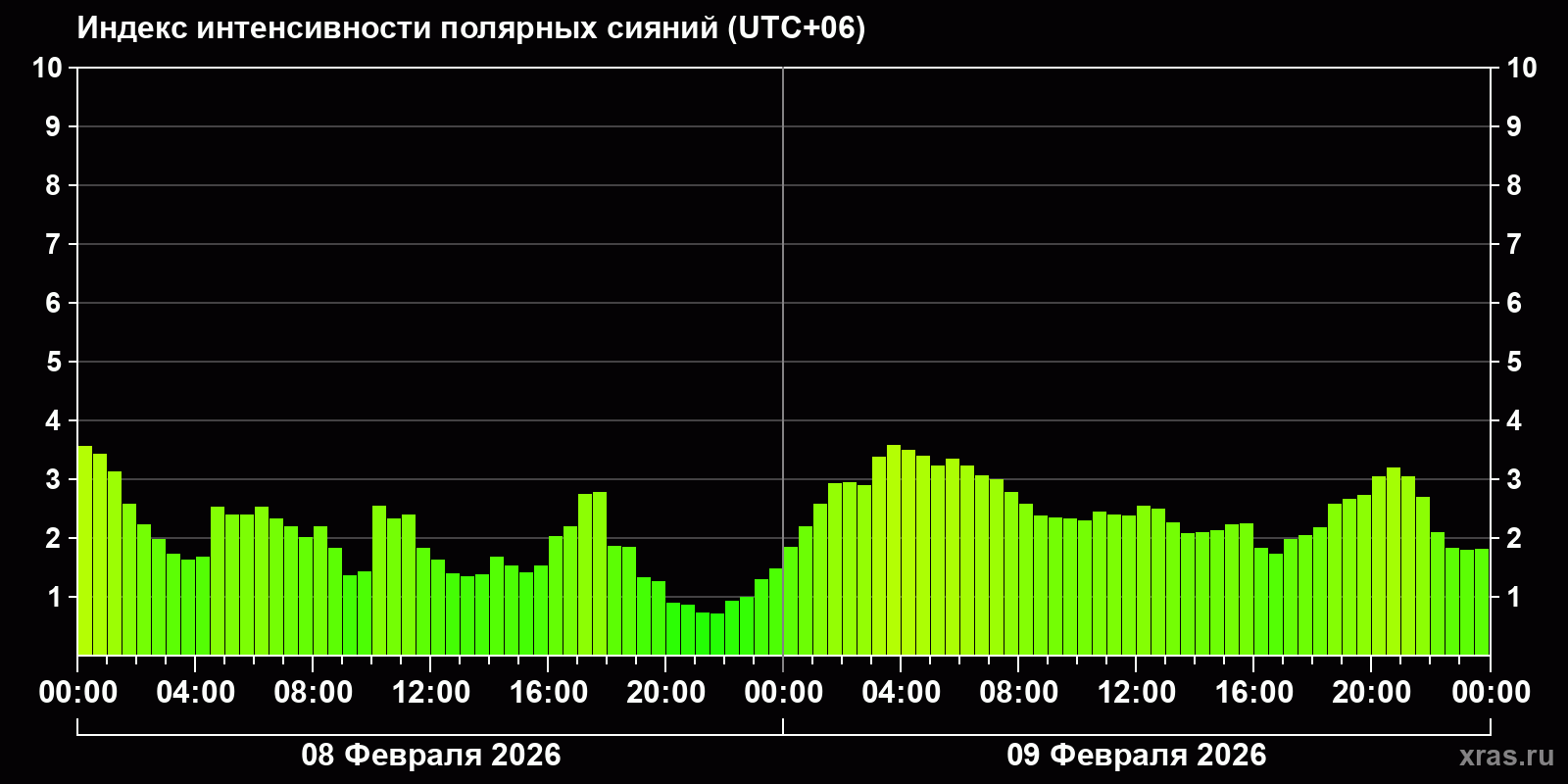 Изменения индекса интенсивности полярных сияний с 2026-02-08 по 2026-02-09 по местному времени