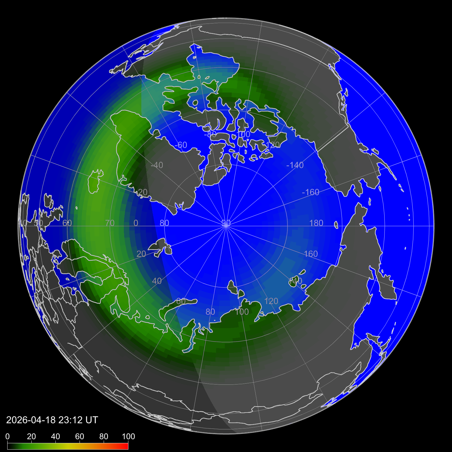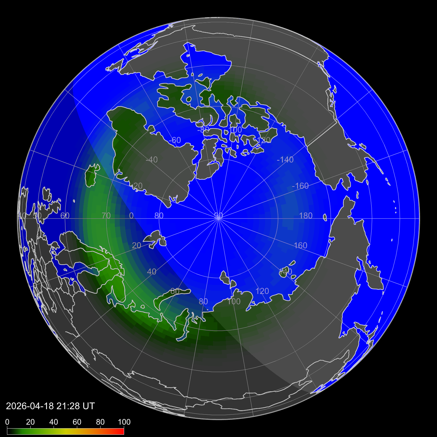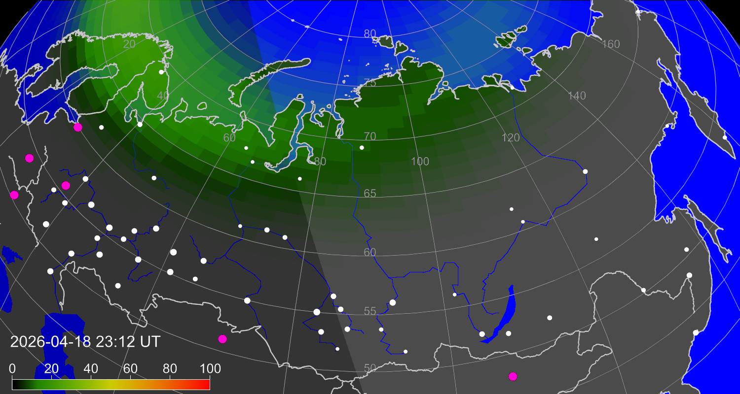 Изменения и часовой прогноз индекса интенсивности полярных сияний с 2026-04-18 по 2026-04-19