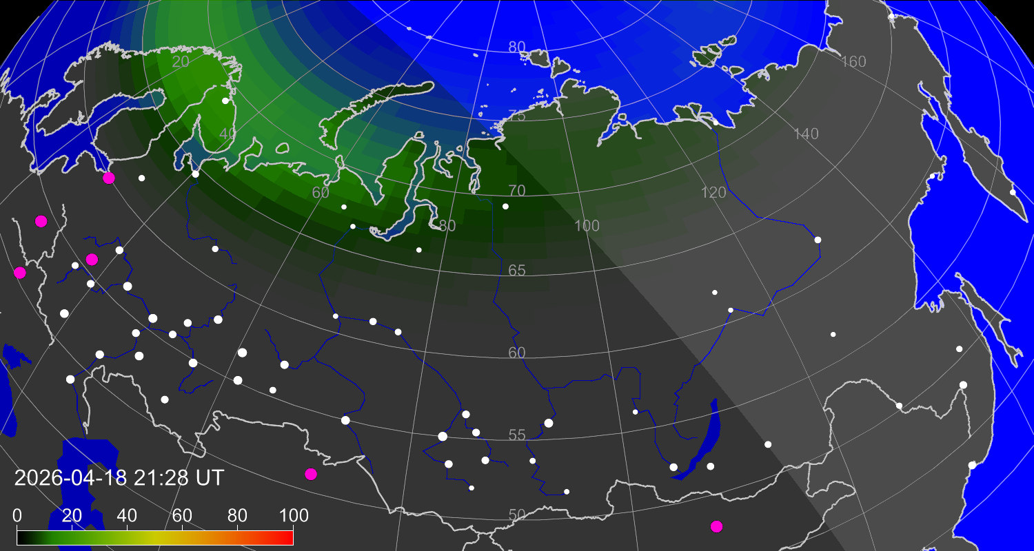 Индекс интенсивности полярных сияний и теоретически возможная широта наблюдений для ночного времени в восточном полушарии