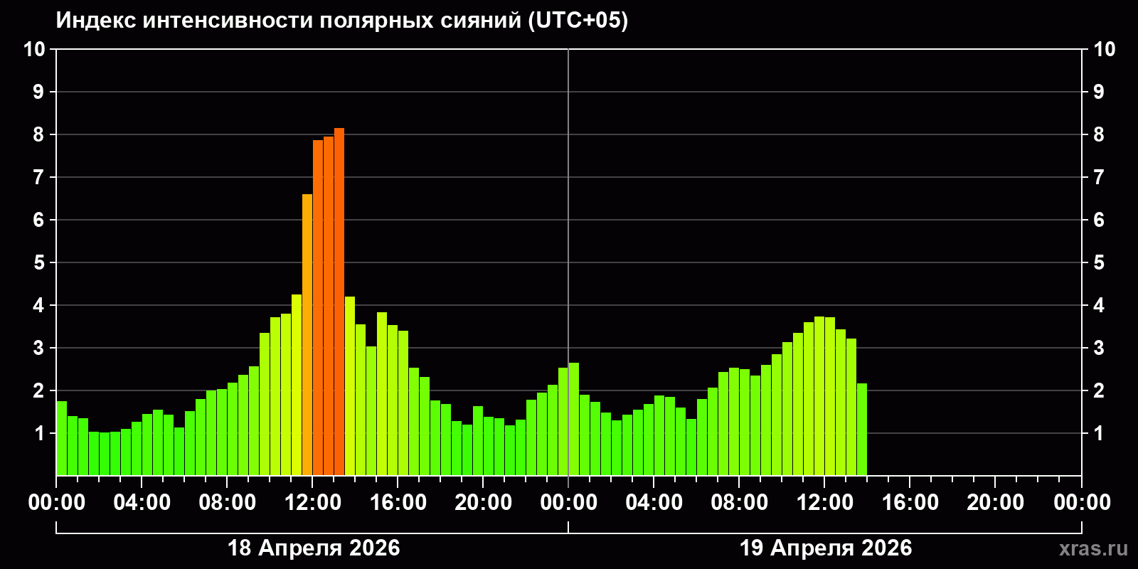 Изменения индекса интенсивности полярных сияний с 2026-04-18 по 2026-04-19 по местному времени