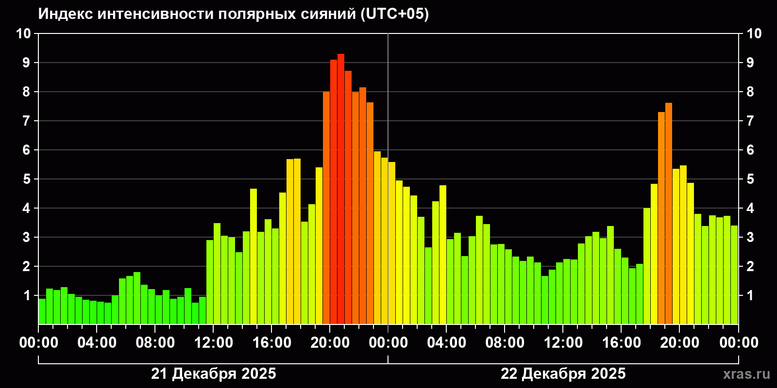 Изменения индекса интенсивности полярных сияний с 2025-12-21 по 2025-12-22 по местному времени