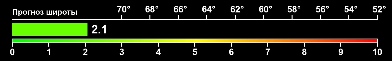 Индекс интенсивности полярных сияний и теоретически возможная широта наблюдений для ночного времени в восточном полушарии по состоянию на 2026-03-26 23:45 (конец дня) по местному времени
