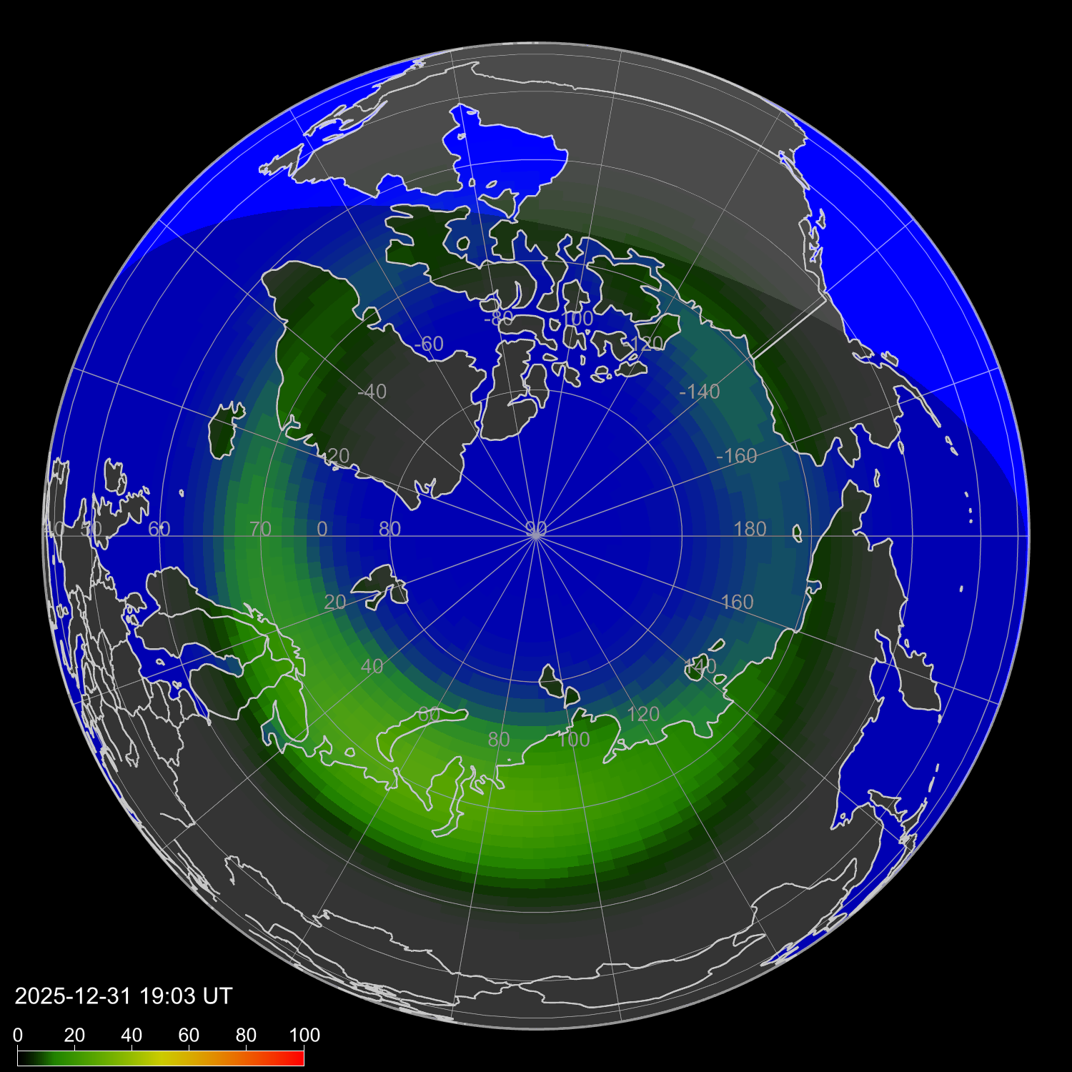 Изменения и часовой прогноз индекса интенсивности полярных сияний с 2025-12-31 по 2026-01-01