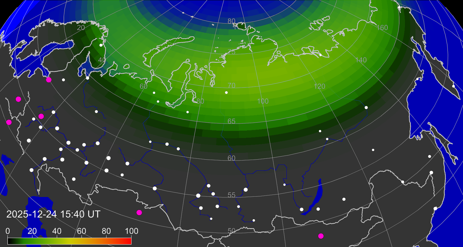 Изменения и часовой прогноз индекса интенсивности полярных сияний с 2025-12-24 по 2025-12-25