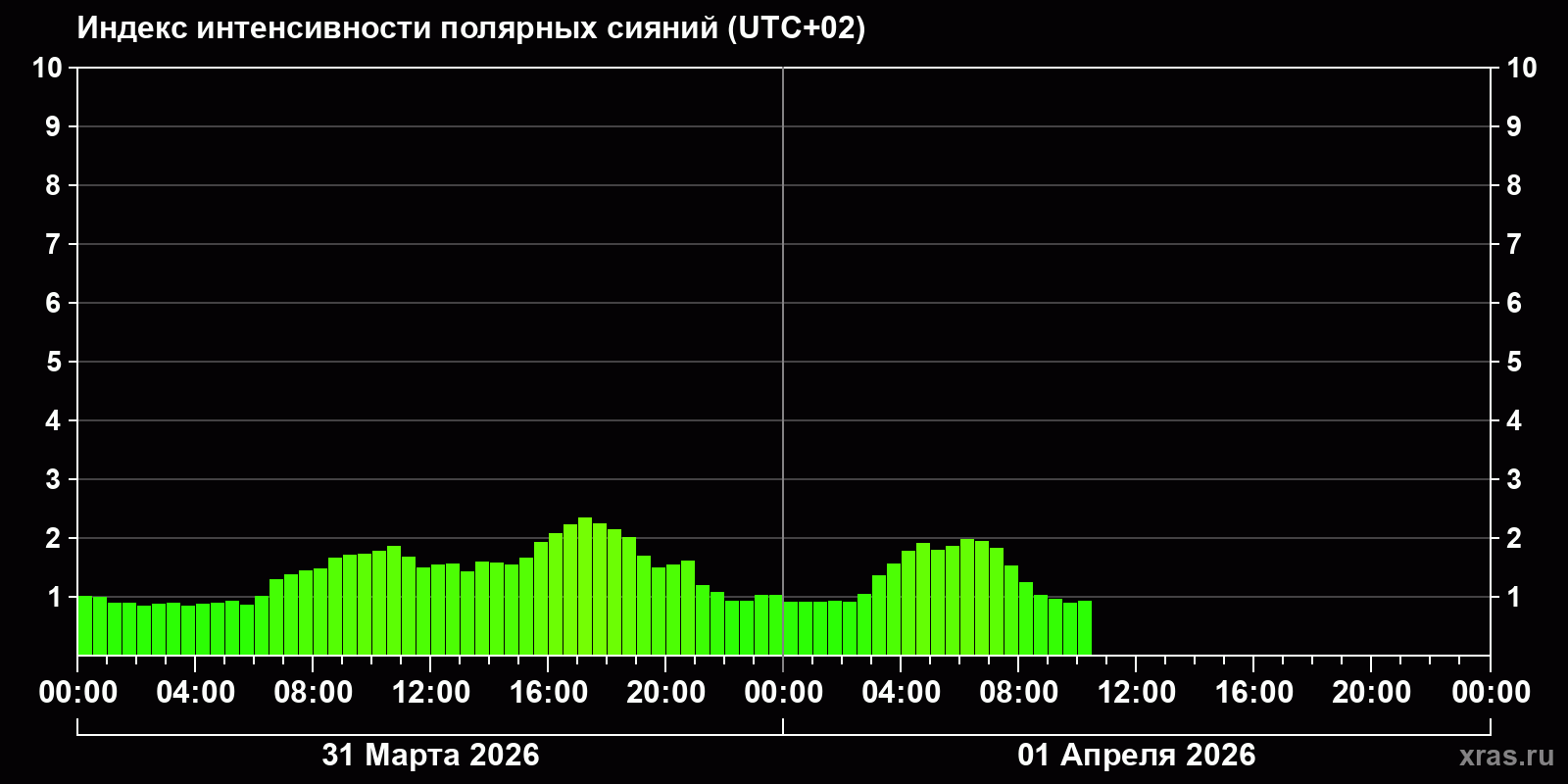 Изменения индекса интенсивности полярных сияний с 2026-03-31 по 2026-04-01 по местному времени