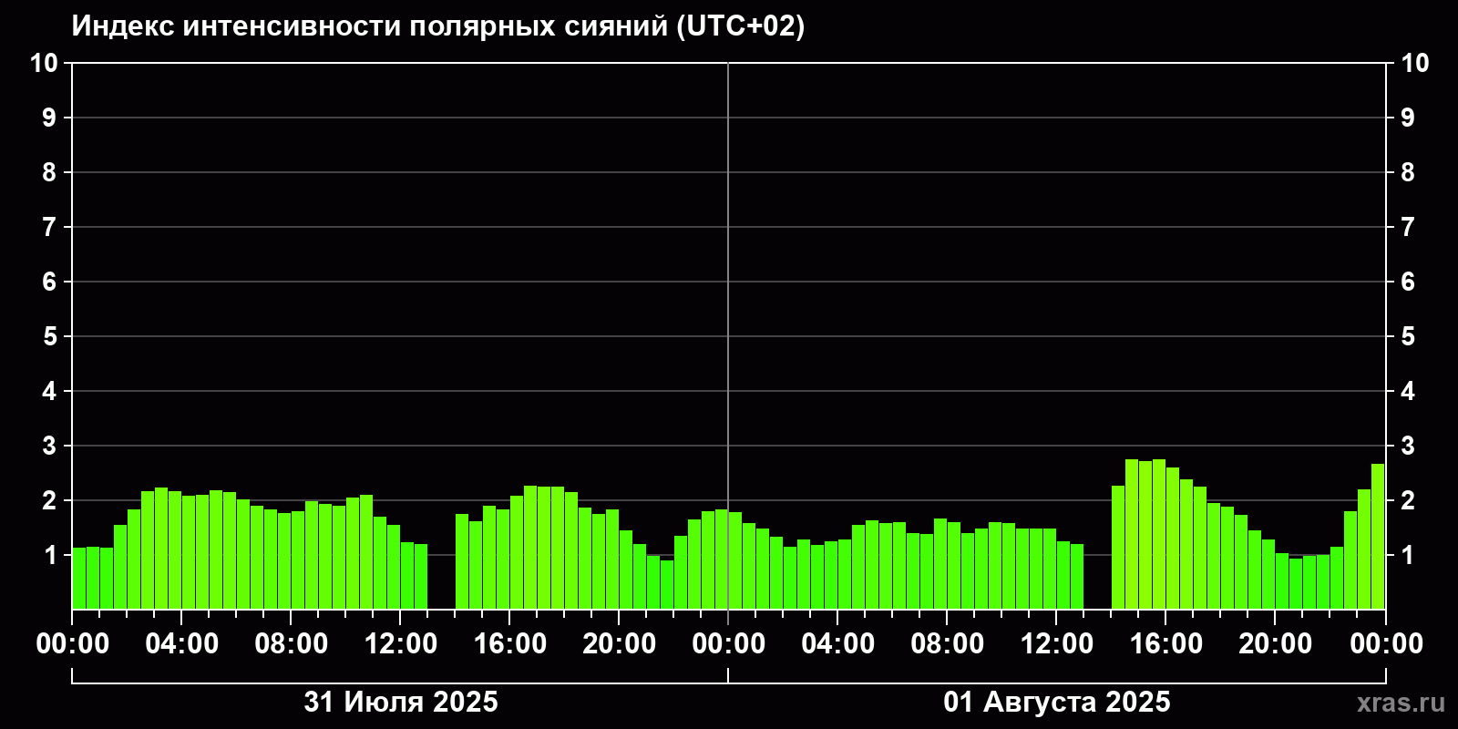 Изменения индекса интенсивности полярных сияний с 2025-07-31 по 2025-08-01 по местному времени