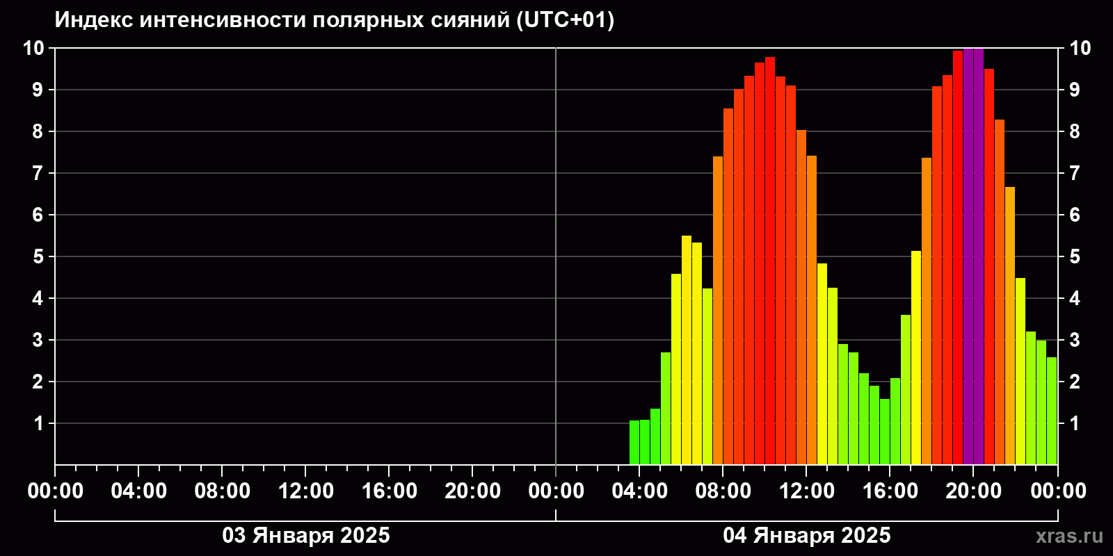 Изменения индекса интенсивности полярных сияний с 2025-01-03 по 2025-01-04 по местному времени