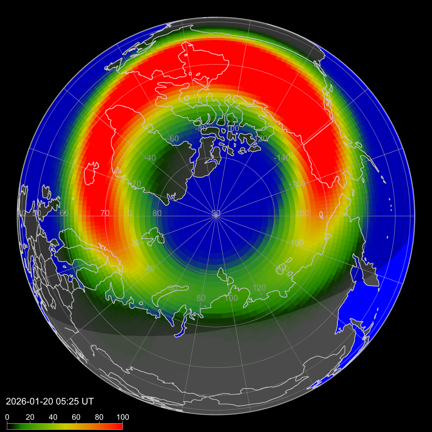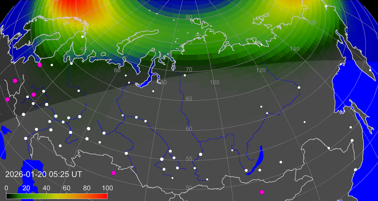 Изменения и часовой прогноз индекса интенсивности полярных сияний с 2026-01-19 по 2026-01-20