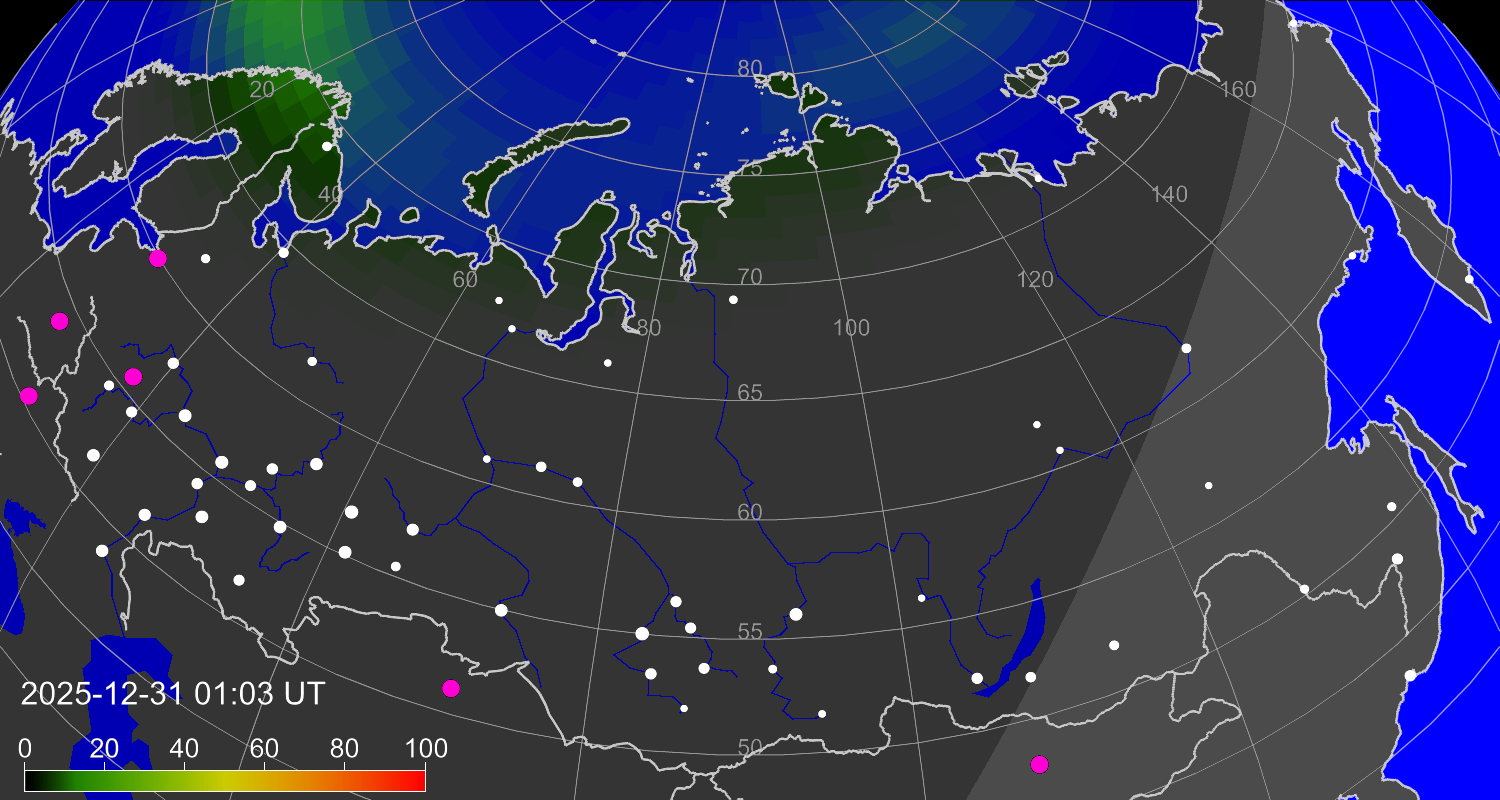 Изменения и часовой прогноз индекса интенсивности полярных сияний с 2025-12-31 по 2026-01-01