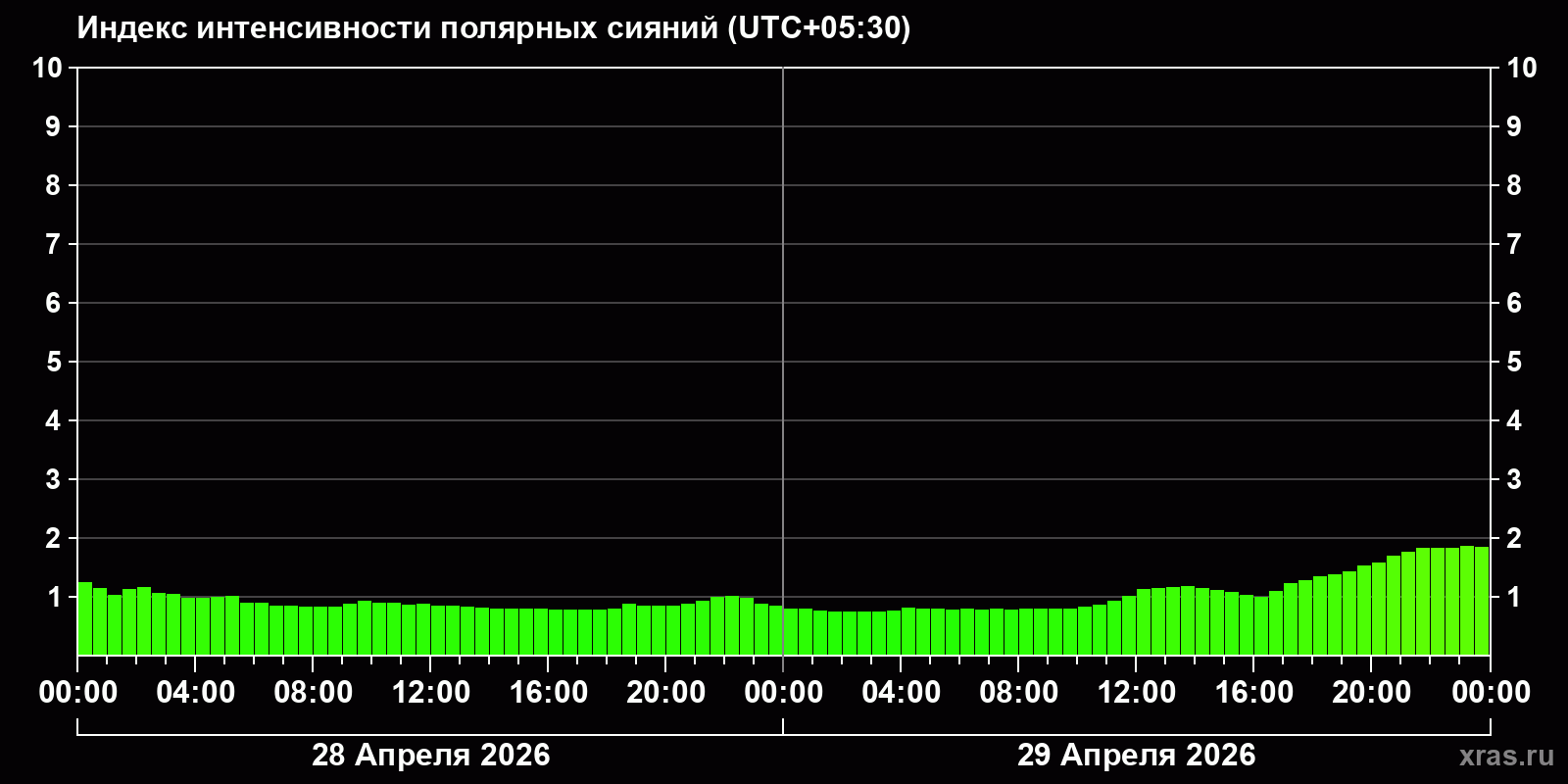 Изменения индекса интенсивности полярных сияний с 2026-04-28 по 2026-04-29 по местному времени