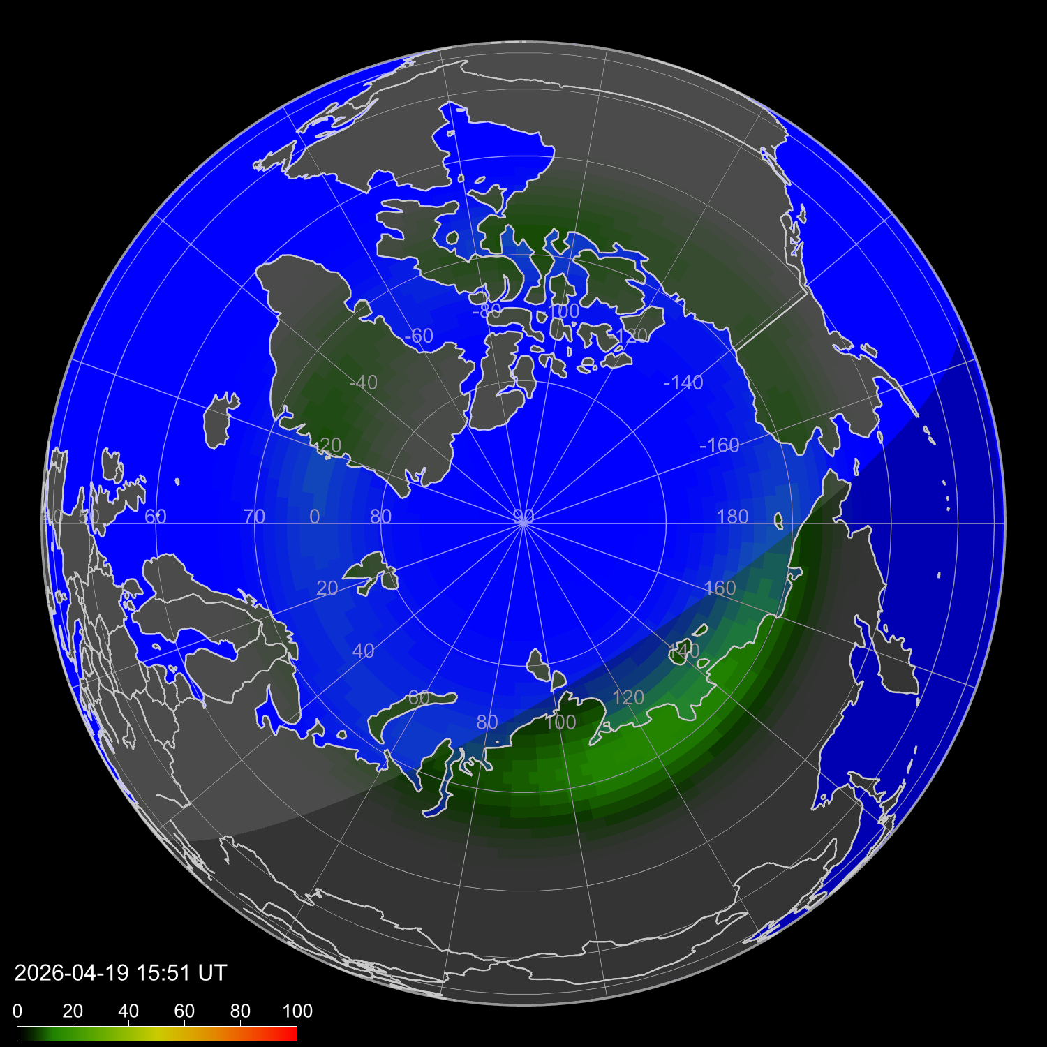 Индекс интенсивности полярных сияний и теоретически возможная широта наблюдений для ночного времени в восточном полушарии