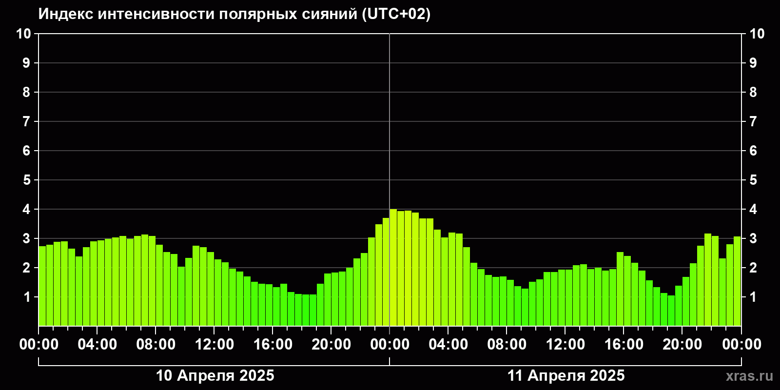 Изменения индекса интенсивности полярных сияний с 2025-04-10 по 2025-04-11 по местному времени