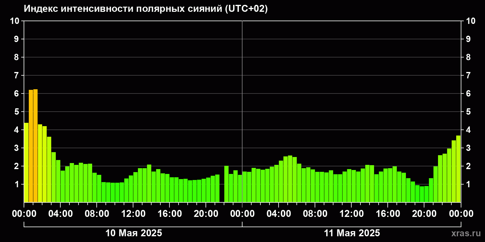 Изменения индекса интенсивности полярных сияний с 2025-05-10 по 2025-05-11 по местному времени