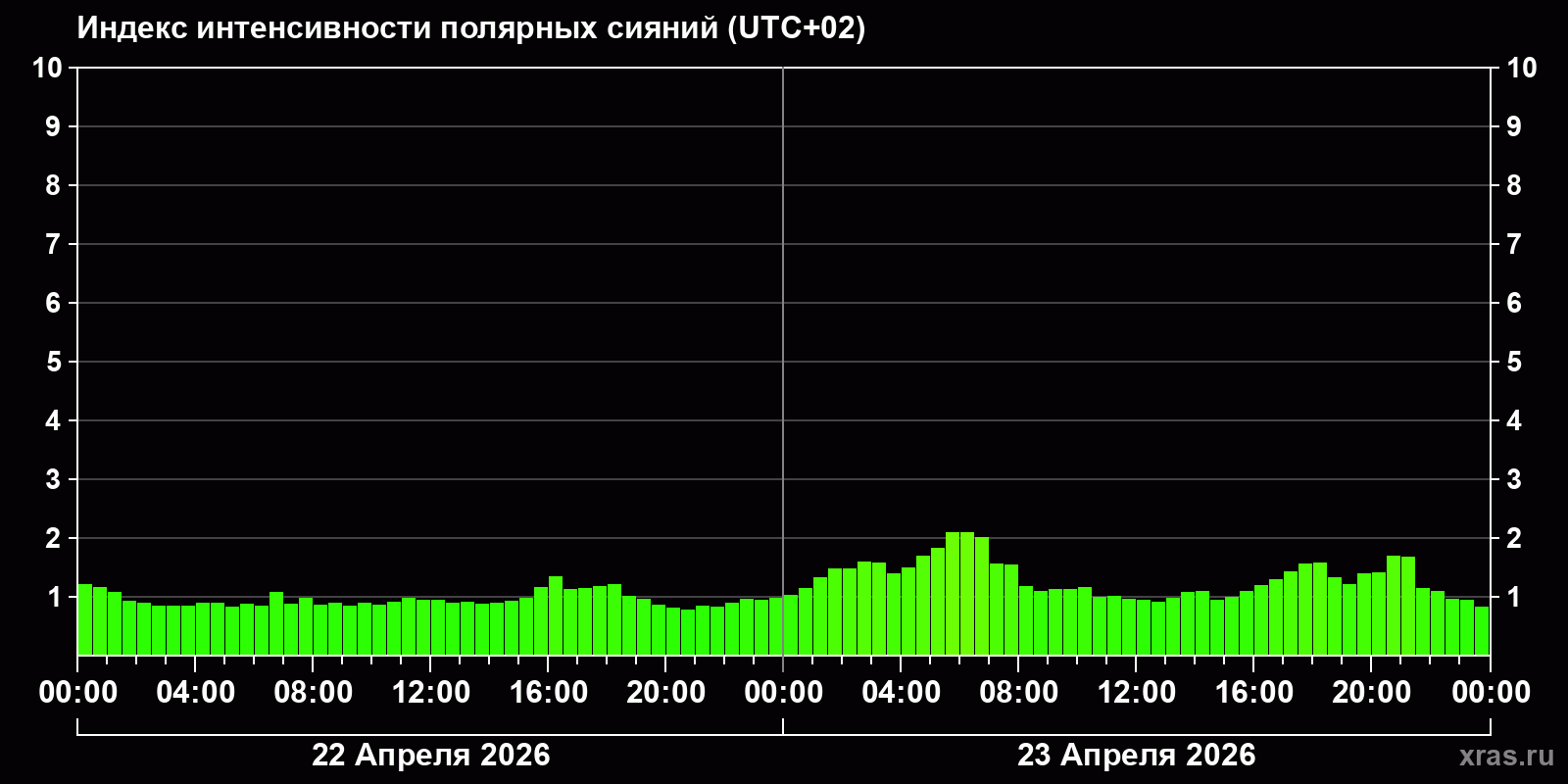 Изменения индекса интенсивности полярных сияний с 2026-04-22 по 2026-04-23 по местному времени