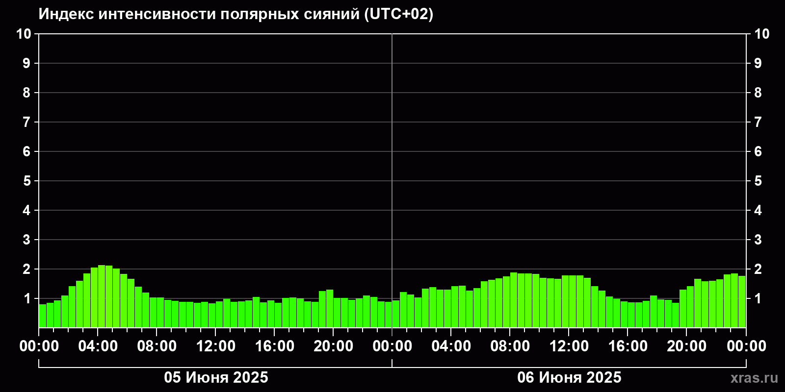 Изменения индекса интенсивности полярных сияний с 2025-06-05 по 2025-06-06 по местному времени