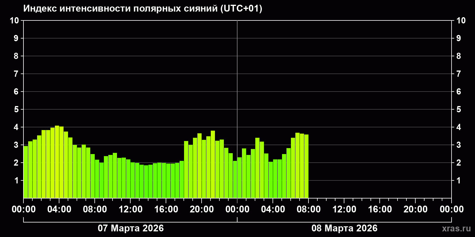 Изменения индекса интенсивности полярных сияний с 2026-03-07 по 2026-03-08 по местному времени