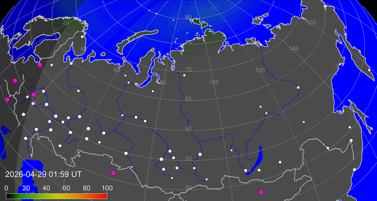 Вероятность полярных сияний в городах Российской Федерации