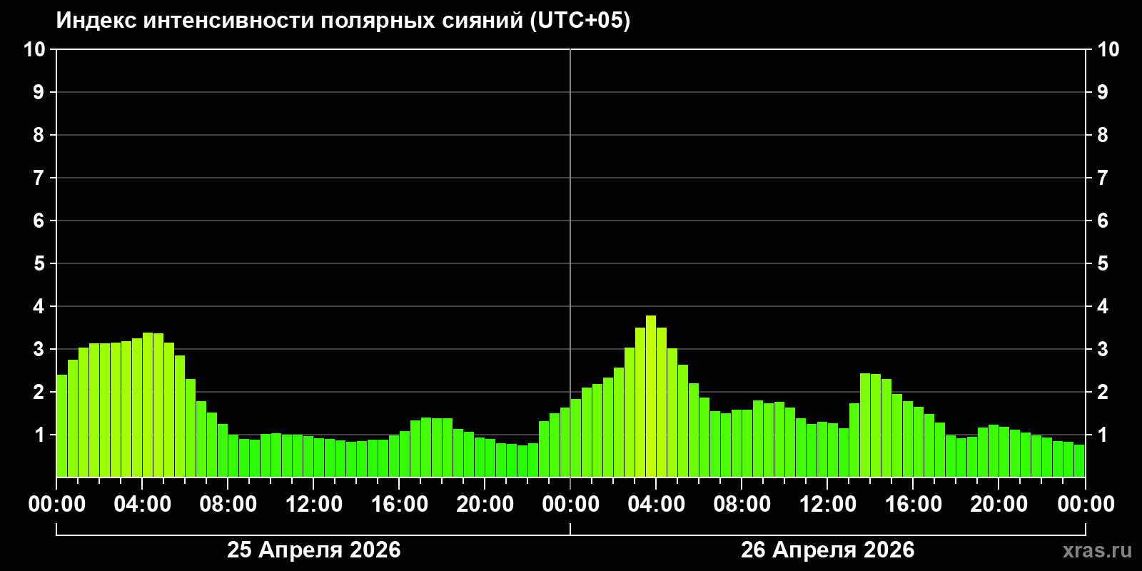 Изменения индекса интенсивности полярных сияний с 2026-04-25 по 2026-04-26 по местному времени