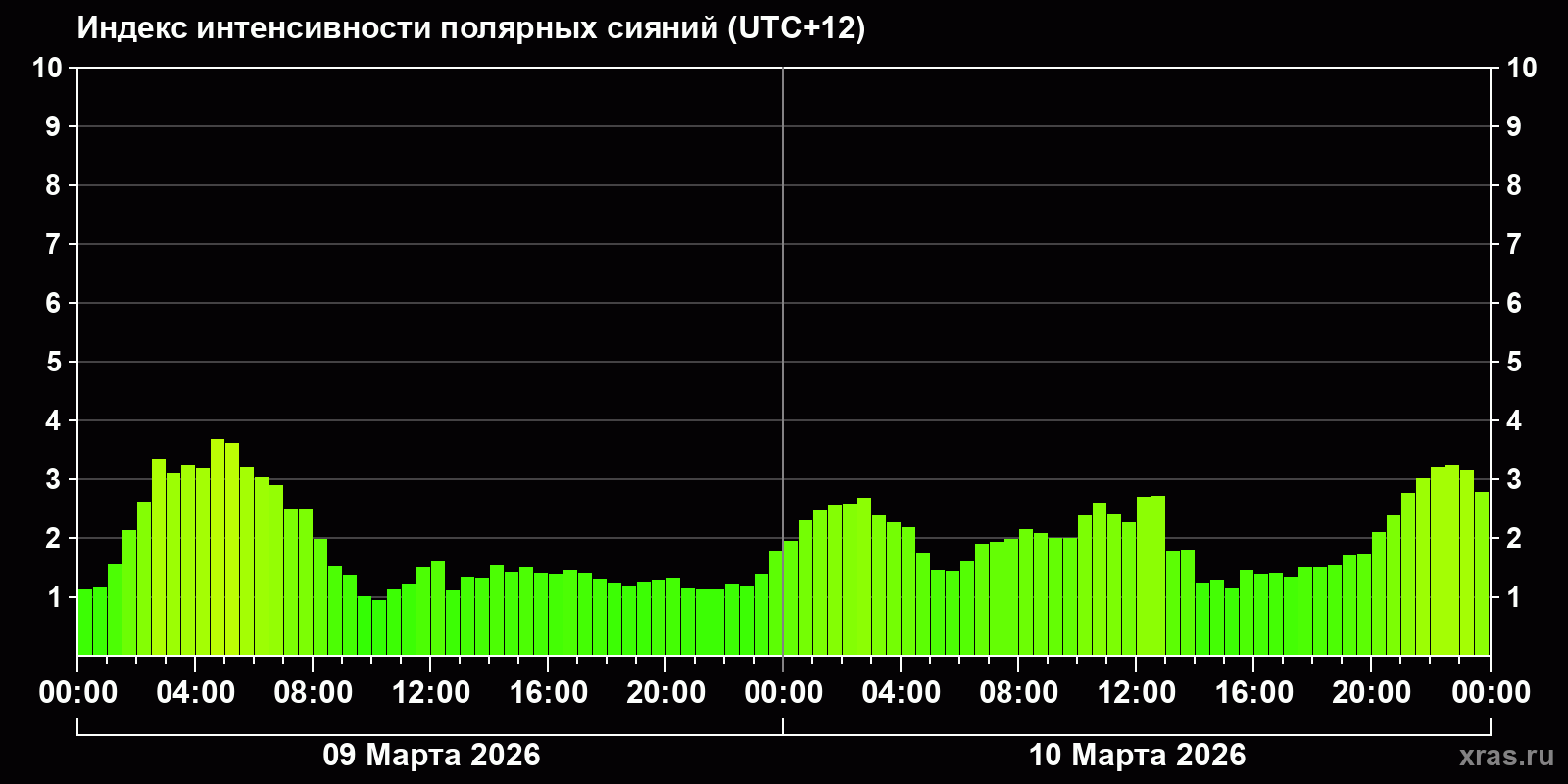Изменения индекса интенсивности полярных сияний с 2026-03-09 по 2026-03-10 по местному времени