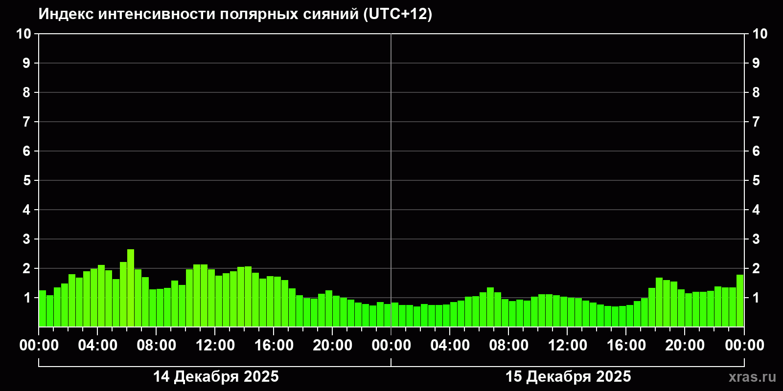 Изменения индекса интенсивности полярных сияний с 2025-12-14 по 2025-12-15 по местному времени