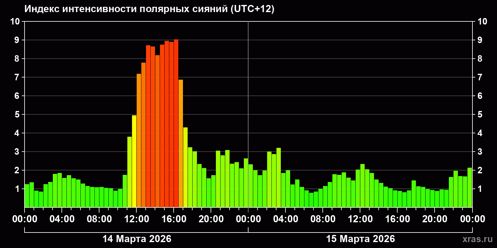 Изменения индекса интенсивности полярных сияний с 2026-03-14 по 2026-03-15 по местному времени