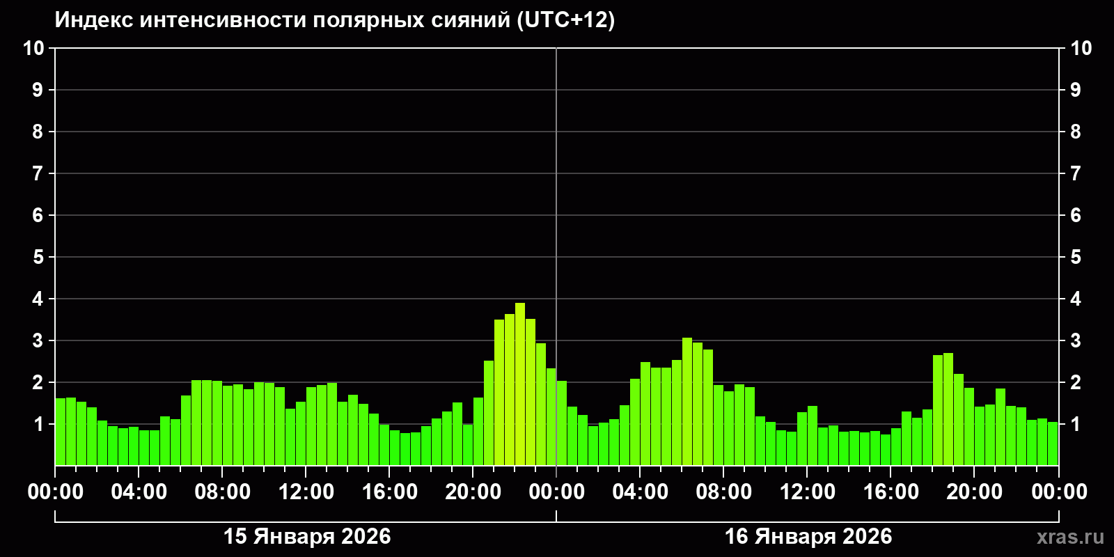 Изменения индекса интенсивности полярных сияний с 2026-01-15 по 2026-01-16 по местному времени