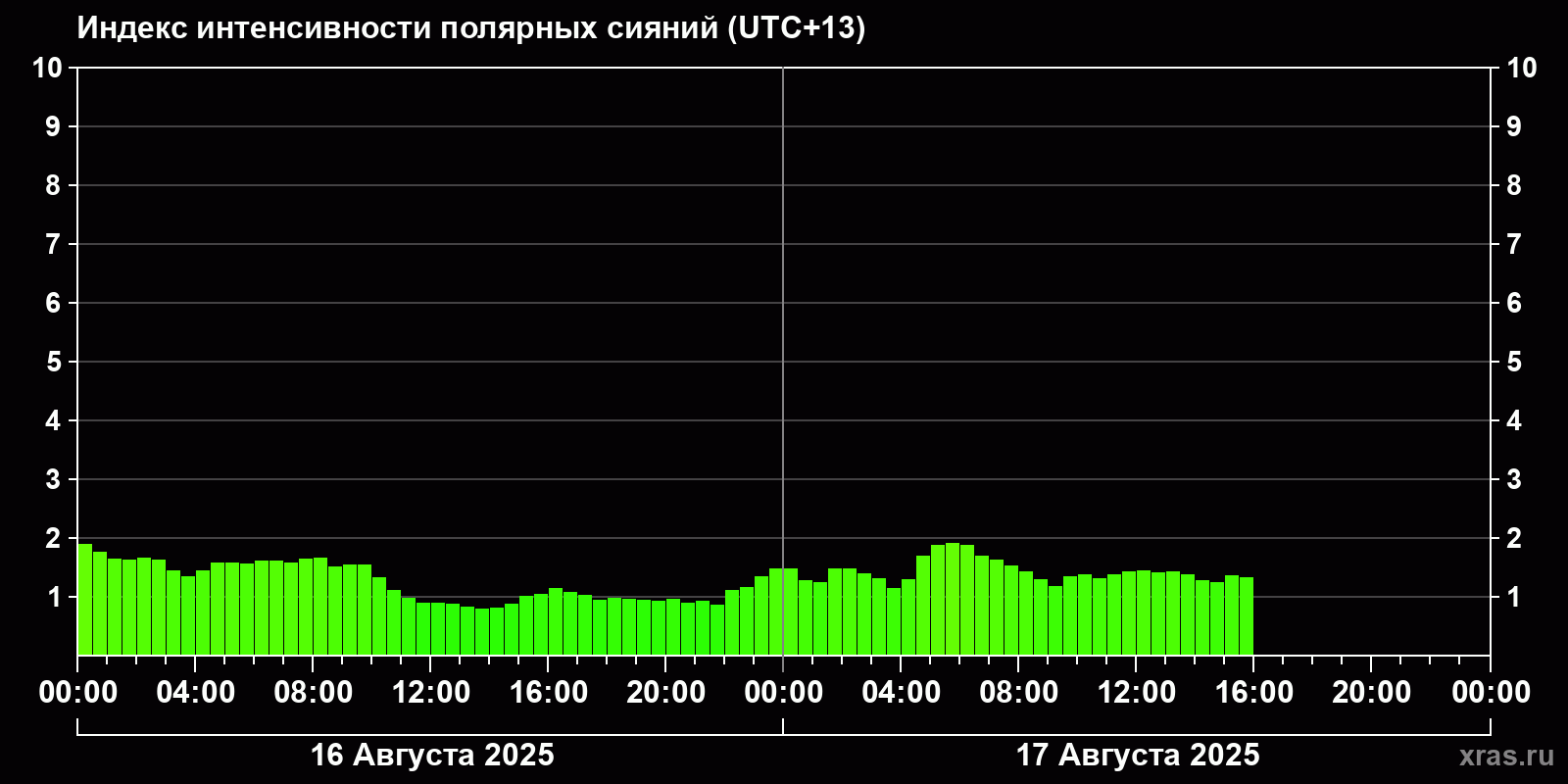 Изменения индекса интенсивности полярных сияний с 2025-08-16 по 2025-08-17 по местному времени