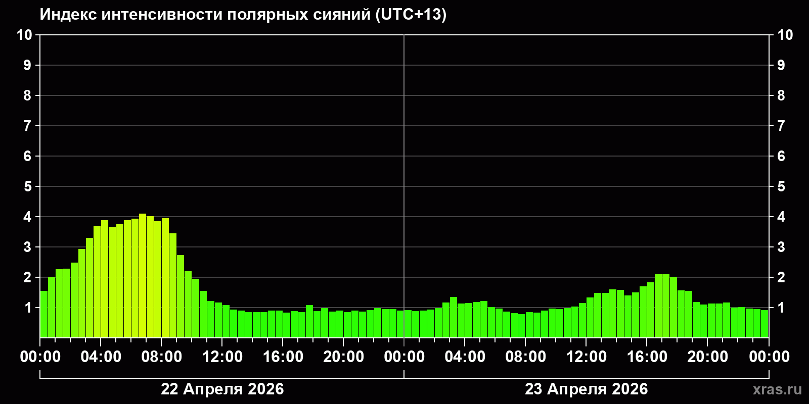Изменения индекса интенсивности полярных сияний с 2026-04-22 по 2026-04-23 по местному времени