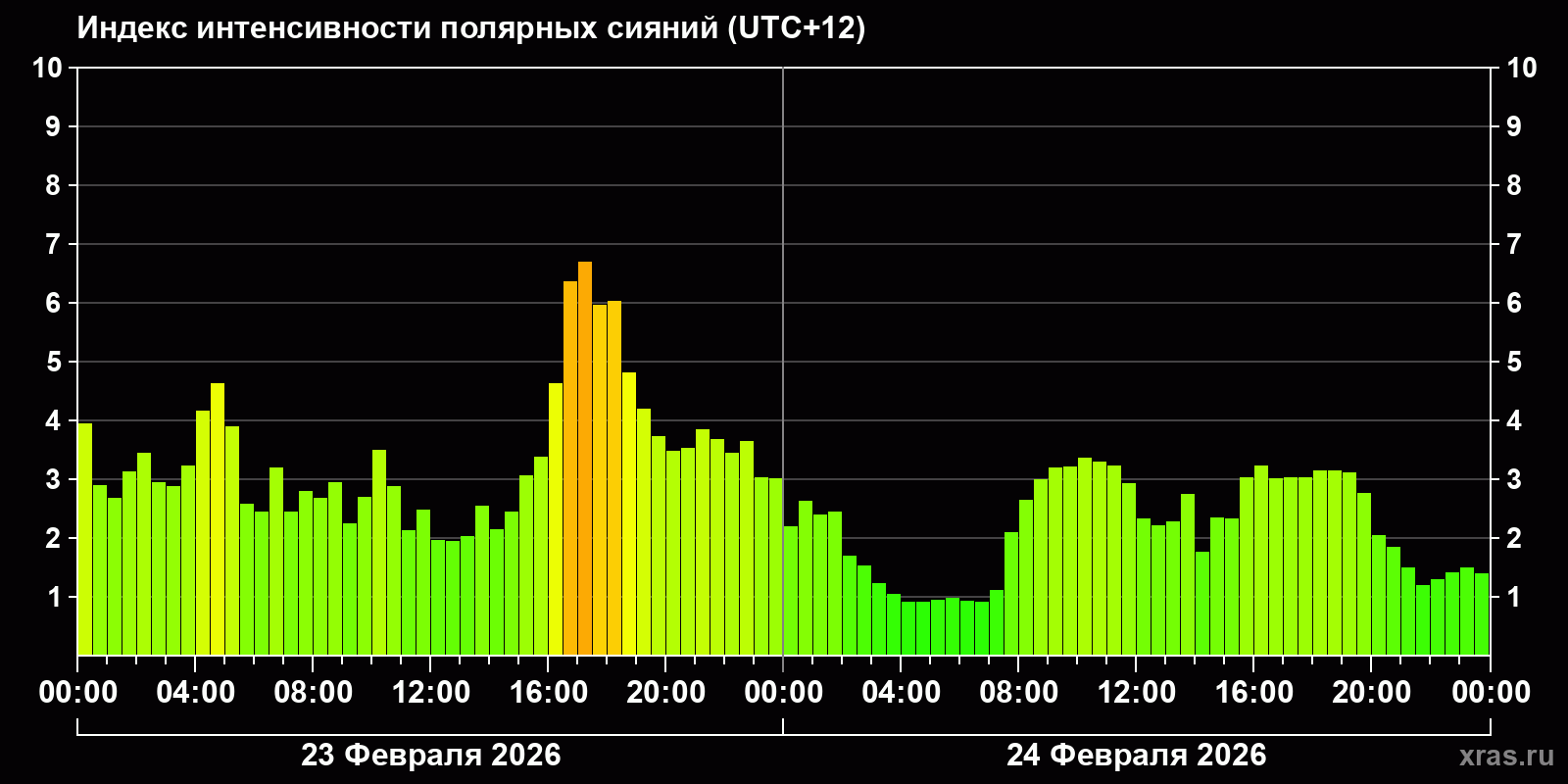 Изменения индекса интенсивности полярных сияний с 2026-02-23 по 2026-02-24 по местному времени