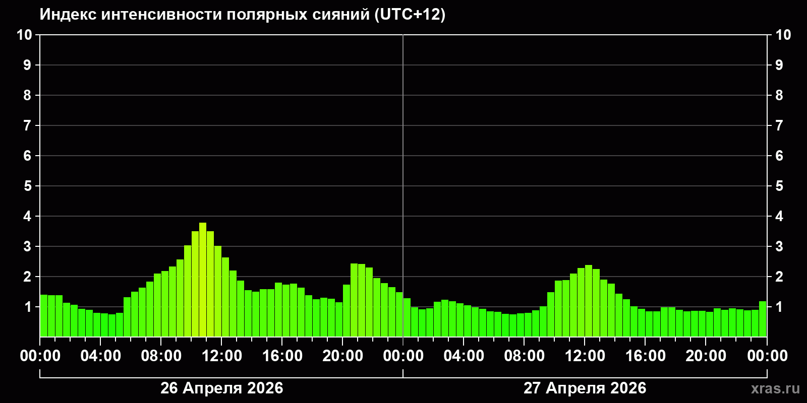 Изменения индекса интенсивности полярных сияний с 2026-04-26 по 2026-04-27 по местному времени