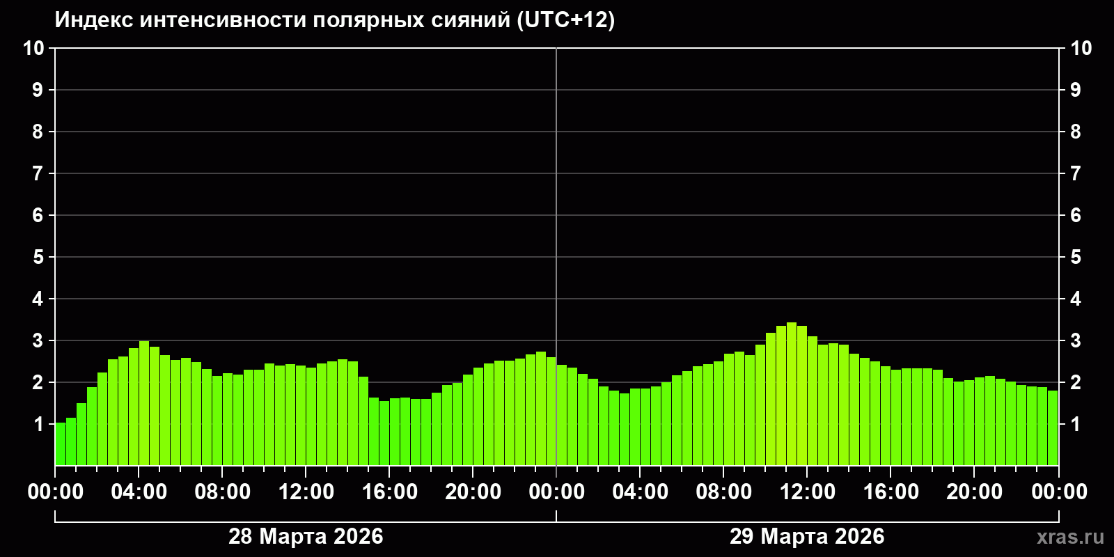 Изменения индекса интенсивности полярных сияний с 2026-03-28 по 2026-03-29 по местному времени
