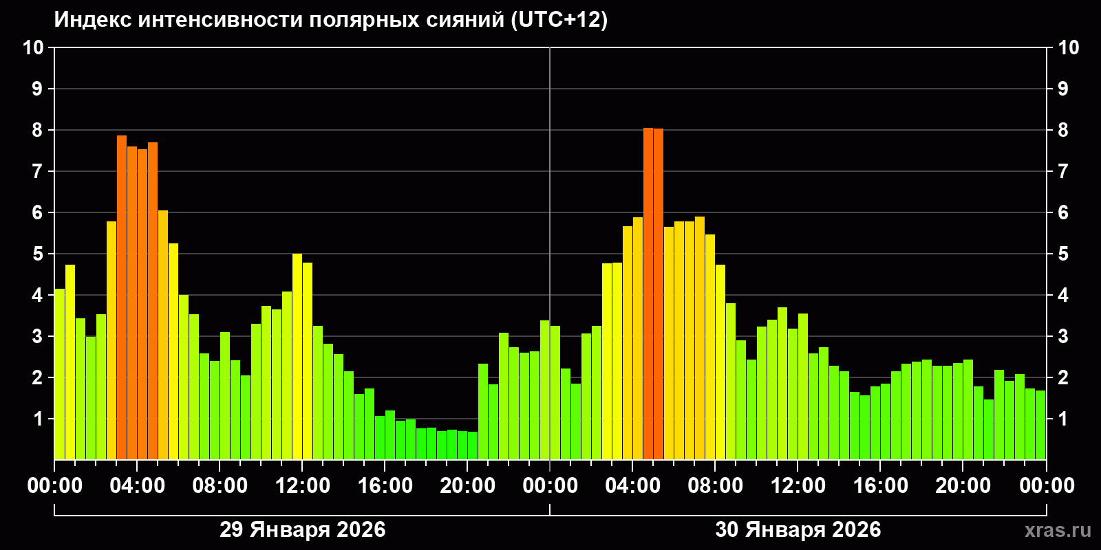 Изменения индекса интенсивности полярных сияний с 2026-01-29 по 2026-01-30 по местному времени