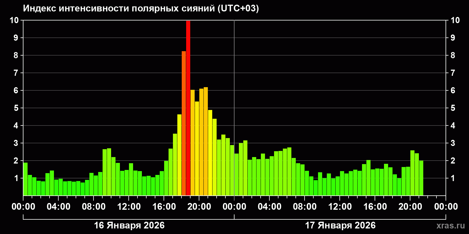Изменения индекса интенсивности полярных сияний с 2026-01-16 по 2026-01-17 по местному времени