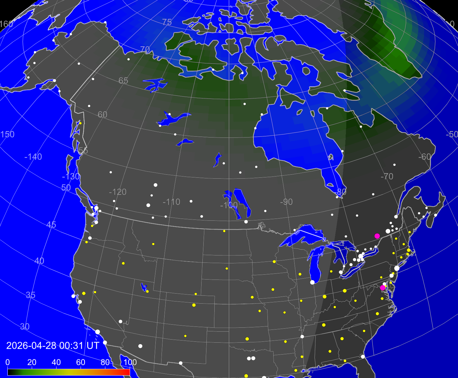 Индекс интенсивности полярных сияний и теоретически возможная широта наблюдений для ночного времени в западном полушарии