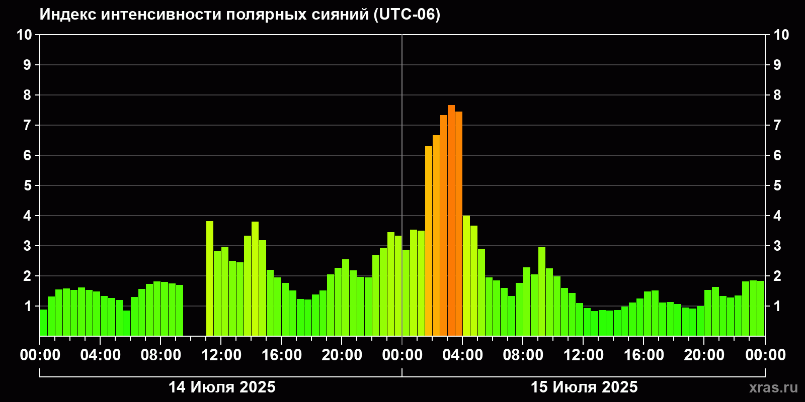 Изменения индекса интенсивности полярных сияний с 2025-07-14 по 2025-07-15 по местному времени