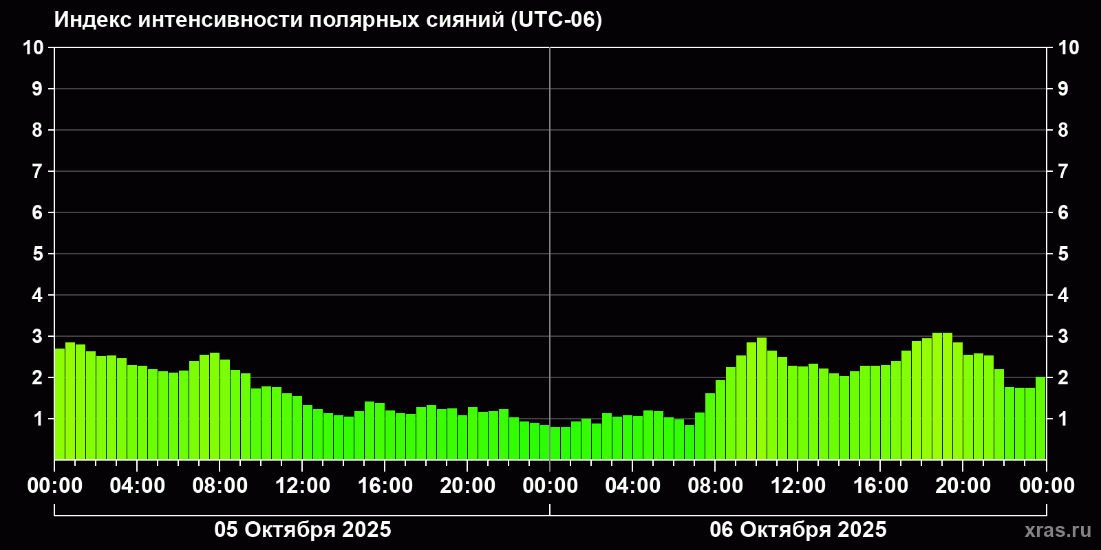 Изменения индекса интенсивности полярных сияний с 2025-10-05 по 2025-10-06 по местному времени