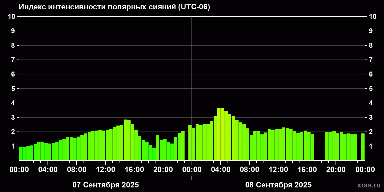 Изменения индекса интенсивности полярных сияний с 2025-09-07 по 2025-09-08 по местному времени