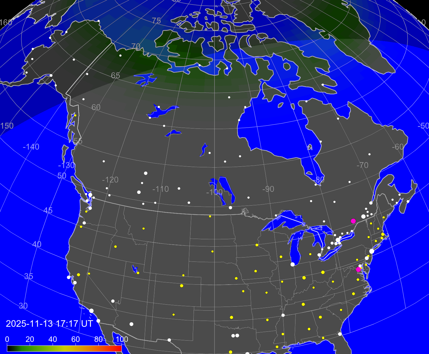 Вероятность полярных сияний в городах США