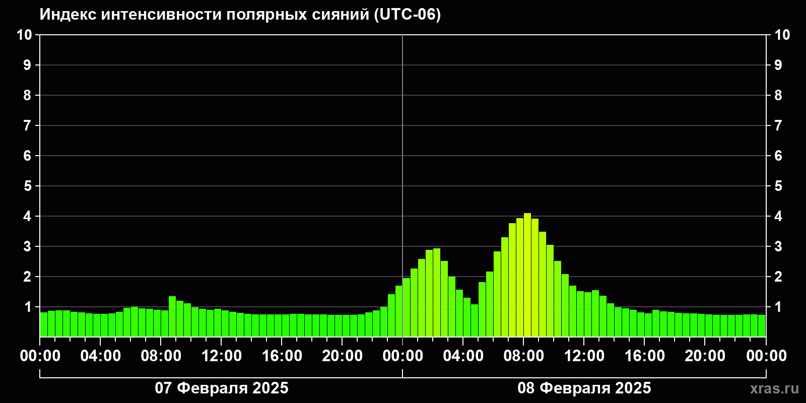 Изменения индекса интенсивности полярных сияний с 2025-02-07 по 2025-02-08 по местному времени