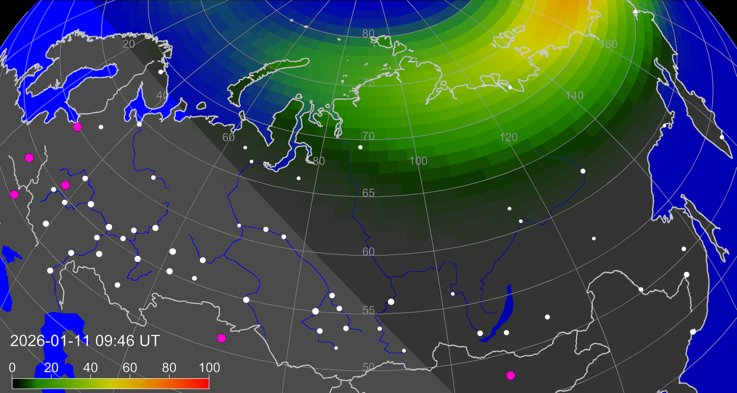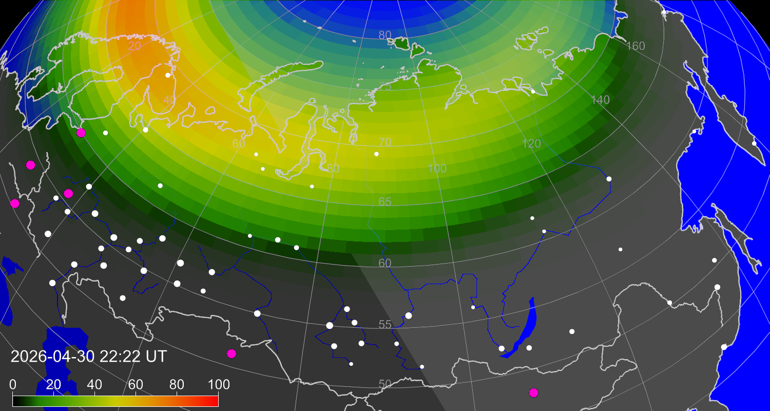 Индекс интенсивности полярных сияний и теоретически возможная широта наблюдений для ночного времени в восточном полушарии
