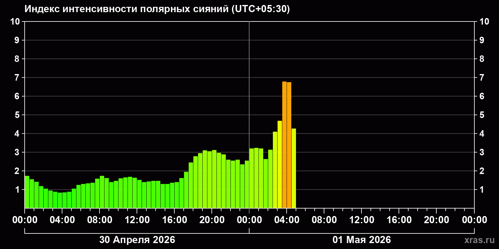 Изменения индекса интенсивности полярных сияний с 2026-04-30 по 2026-05-01 по местному времени